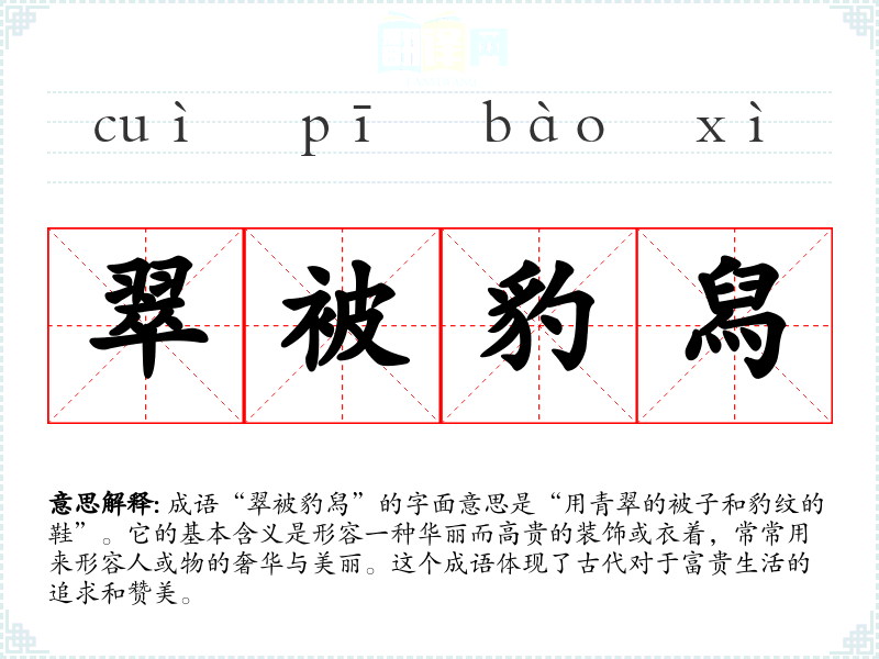 成语“翠被豹舄”的字面意思是“用青翠的被子和豹纹的鞋”。它的基本含义是形容一种华丽而高贵的装饰或衣着,常常用来形容人或物的奢华与美丽。这个成语体现了古代对于富贵生活的追求和赞美。