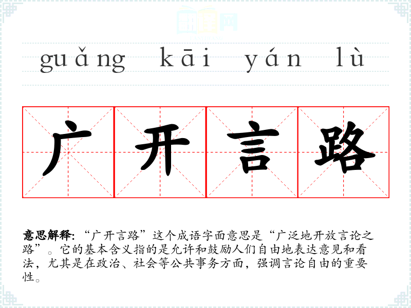 “广开言路”这个成语字面意思是“广泛地开放言论之路”。它的基本含义指的是允许和鼓励人们自由地表达意见和看法,尤其是在政治、社会等公共事务方面,强调****的重要性。