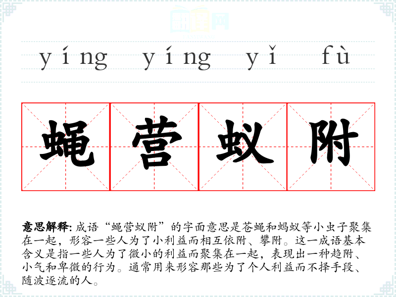 成语“蝇营蚁附”的字面意思是苍蝇和蚂蚁等小虫子聚集在一起,形容一些人为了小利益而相互依附、攀附。这一成语基本含义是指一些人为了微小的利益而聚集在一起,表现出一种趋附、小气和卑微的行为。通常用来形容那些为了个人利益而不择手段、随波逐流的人。