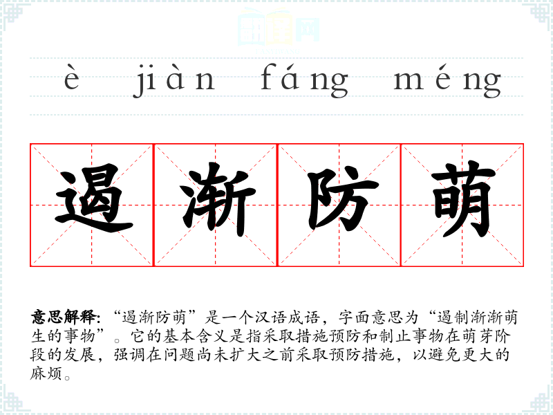 “遏渐防萌”是一个汉语成语,字面意思为“遏制渐渐萌生的事物”。它的基本含义是指采取措施预防和制止事物在萌芽阶段的发展,强调在问题尚未扩大之前采取预防措施,以避免更大的麻烦。
