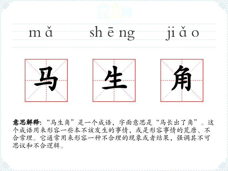 “马生角”是一个成语,字面意思是“马长出了角”。这个成语用来形容一些本不该发生的事情,或是形容事情的荒唐、不合常理。它通常用来形容一种不合理的现象或者结果,强调其不可思议和不合逻辑。