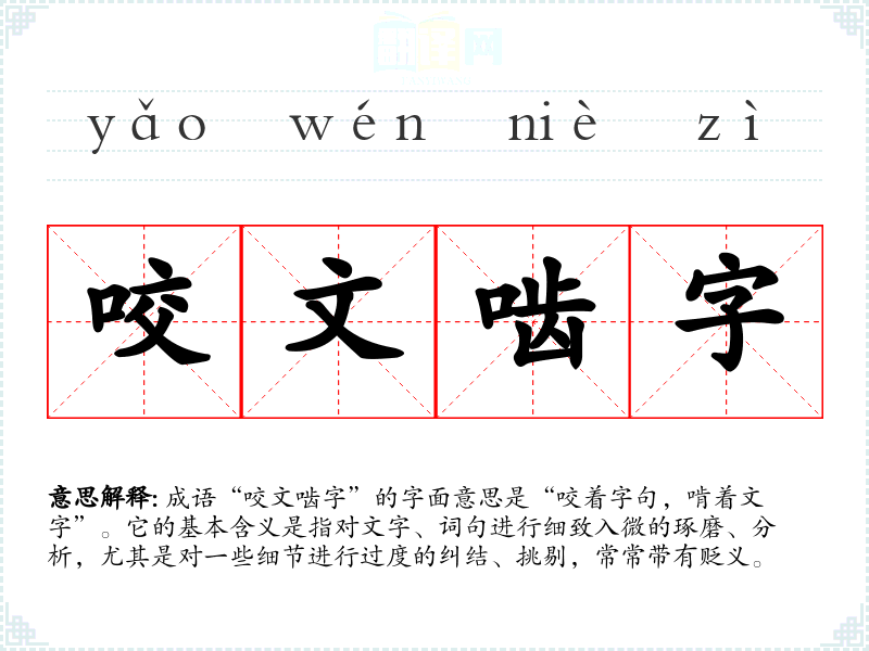 成语“咬文啮字”的字面意思是“咬着字句,啃着文字”。它的基本含义是指对文字、词句进行细致入微的琢磨、分析,尤其是对一些细节进行过度的纠结、挑剔,常常带有贬义。