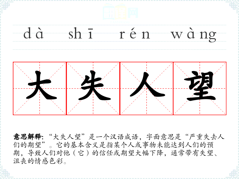 “大失人望”是一个汉语成语,字面意思是“严重失去人们的期望”。它的基本含义是指某个人或事物未能达到人们的预期,导致人们对他(它)的信任或期望大幅下降,通常带有失望、沮丧的情感色彩。