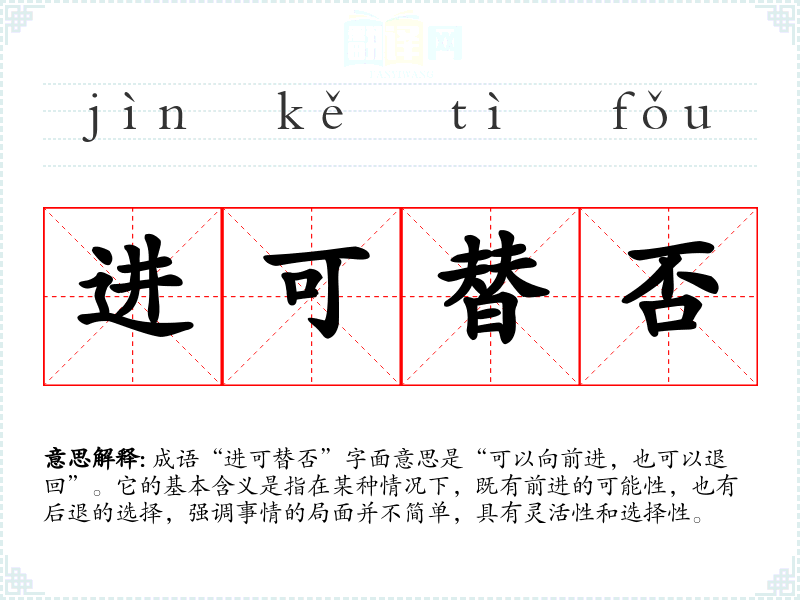 成语“进可替否”字面意思是“可以向前进,也可以退回”。它的基本含义是指在某种情况下,既有前进的可能性,也有后退的选择,强调事情的局面并不简单,具有灵活性和选择性。