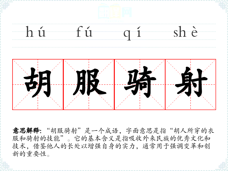 “胡服骑射”是一个成语,字面意思是指“胡人所穿的衣服和骑射的技能”。它的基本含义是指吸收外来民族的优秀文化和技术,借鉴他人的长处以增强自身的实力,通常用于强调变革和创新的重要性。