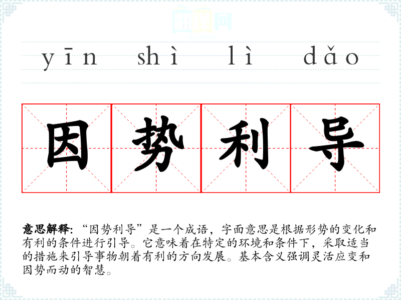“因势利导”是一个成语,字面意思是根据形势的变化和有利的条件进行引导。它意味着在特定的环境和条件下,采取适当的措施来引导事物朝着有利的方向发展。基本含义强调灵活应变和因势而动的智慧。