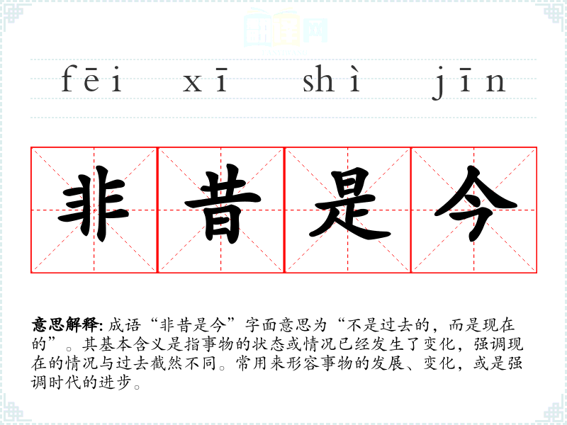 成语“非昔是今”字面意思为“不是过去的,而是现在的”。其基本含义是指事物的状态或情况已经发生了变化,强调现在的情况与过去截然不同。常用来形容事物的发展、变化,或是强调时代的进步。