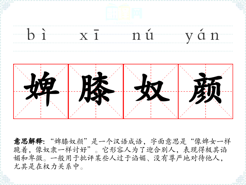 “婢膝奴颜”是一个汉语成语,字面意思是“像婢女一样跪着,像奴隶一样讨好”。它形容人为了迎合别人,表现得极其谄媚和卑微。一般用于批评某些人过于谄媚、没有尊严地对待他人,尤其是在权力关系中。