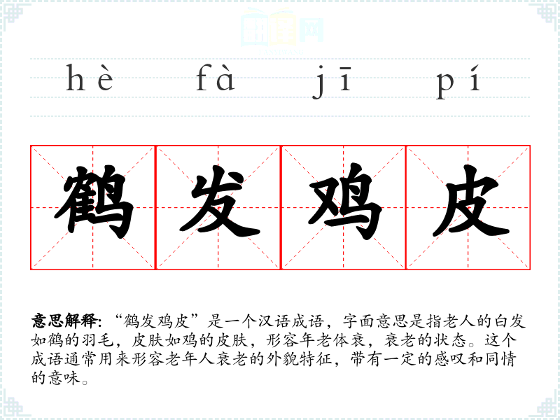 “鹤发鸡皮”是一个汉语成语,字面意思是指老人的白发如鹤的羽毛,皮肤如鸡的皮肤,形容年老体衰,衰老的状态。这个成语通常用来形容老年人衰老的外貌特征,带有一定的感叹和同情的意味。