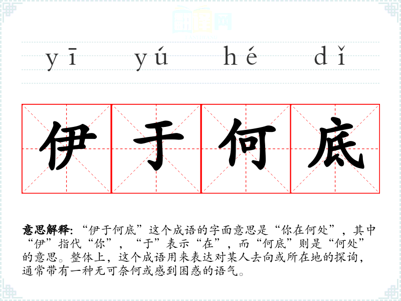 “伊于何底”这个成语的字面意思是“你在何处”,其中“伊”指代“你”,“于”表示“在”,而“何底”则是“何处”的意思。整体上,这个成语用来表达对某人去向或所在地的探询,通常带有一种无可奈何或感到困惑的语气。