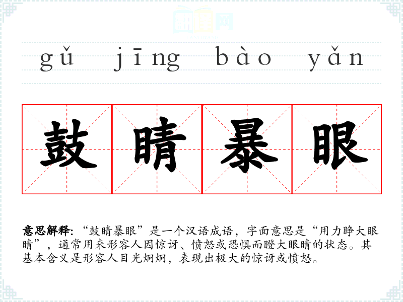 “鼓睛暴眼”是一个汉语成语,字面意思是“用力睁大眼睛”,通常用来形容人因惊讶、愤怒或恐惧而瞪大眼睛的状态。其基本含义是形容人目光炯炯,表现出极大的惊讶或愤怒。