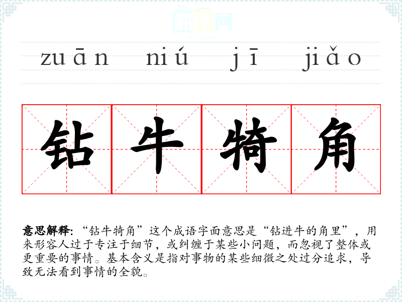 “钻牛犄角”这个成语字面意思是“钻进牛的角里”,用来形容人过于专注于细节,或纠缠于某些小问题,而忽视了整体或更重要的事情。基本含义是指对事物的某些细微之处过分追求,导致无法看到事情的全貌。