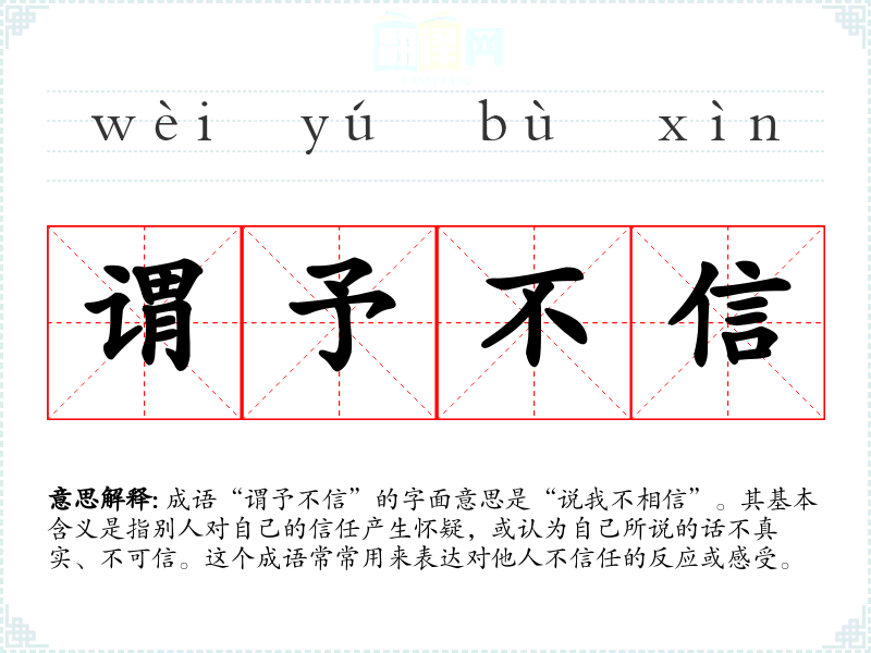 成语“谓予不信”的字面意思是“说我不相信”。其基本含义是指别人对自己的信任产生怀疑,或认为自己所说的话不真实、不可信。这个成语常常用来表达对他人不信任的反应或感受。