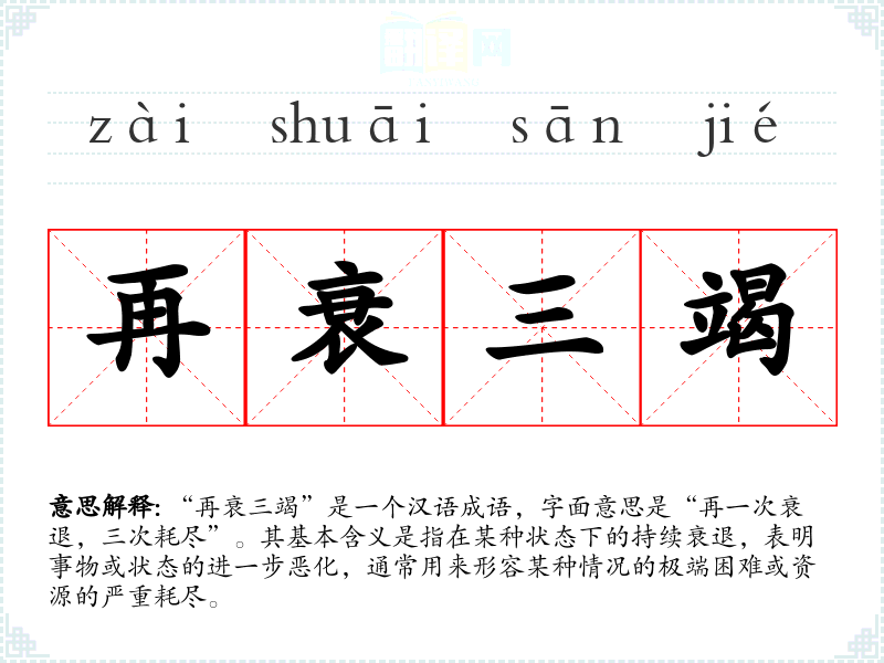 “再衰三竭”是一个汉语成语,字面意思是“再一次衰退,三次耗尽”。其基本含义是指在某种状态下的持续衰退,表明事物或状态的进一步恶化,通常用来形容某种情况的极端困难或资源的严重耗尽。