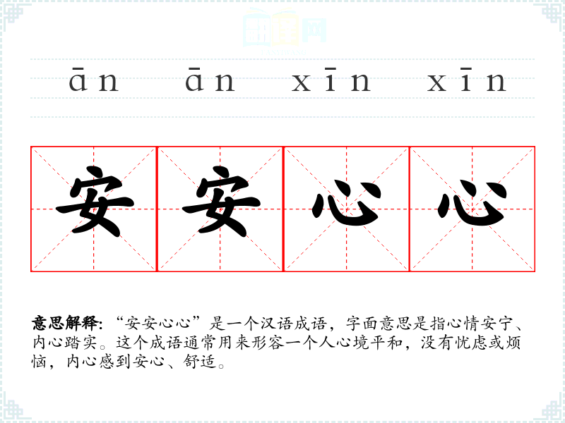 “安安心心”是一个汉语成语,字面意思是指心情安宁、内心踏实。这个成语通常用来形容一个人心境平和,没有忧虑或烦恼,内心感到安心、舒适。