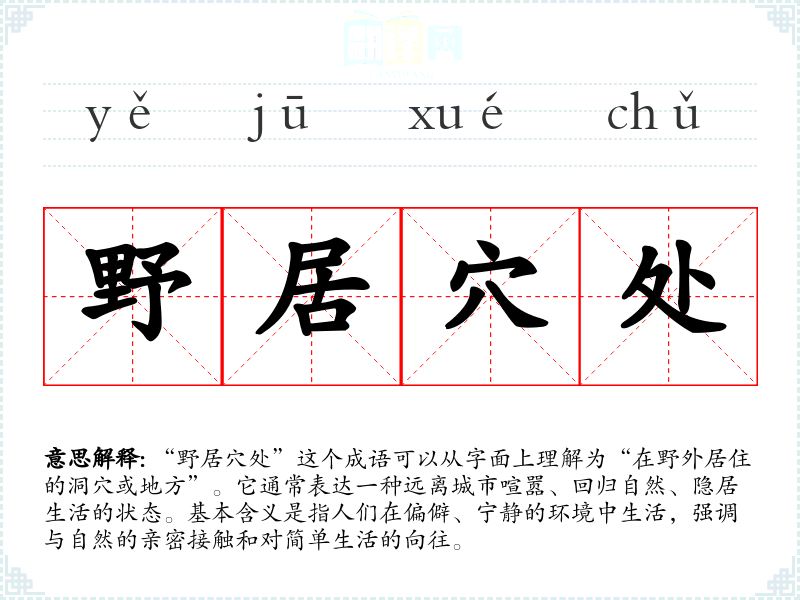“野居穴处”这个成语可以从字面上理解为“在野外居住的洞穴或地方”。它通常表达一种远离城市喧嚣、回归自然、隐居生活的状态。基本含义是指人们在偏僻、宁静的环境中生活,强调与自然的亲密接触和对简单生活的向往。