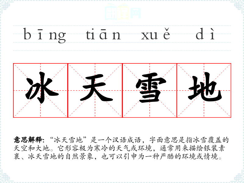 | 冰天雪地 | 形容冰雪漫天盖地。 |
