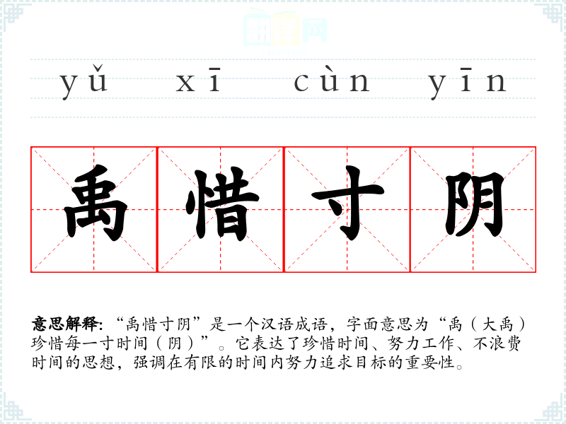 “禹惜寸阴”是一个汉语成语,字面意思为“禹(大禹)珍惜每一寸时间(阴)”。它表达了珍惜时间、努力工作、不浪费时间的思想,强调在有限的时间内努力追求目标的重要性。