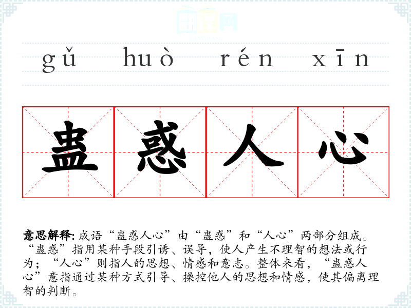 | 蛊惑人心 | 蛊惑:迷惑。指用欺骗引诱等手段迷惑人,搞乱人的思想。 |