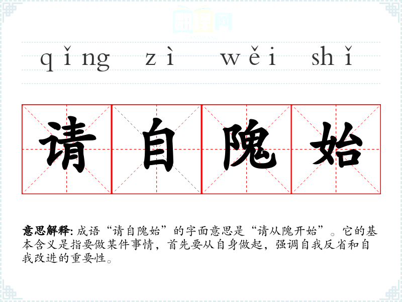 成语“请自隗始”的字面意思是“请从隗开始”。它的基本含义是指要做某件事情,首先要从自身做起,强调自我反省和自我改进的重要性。