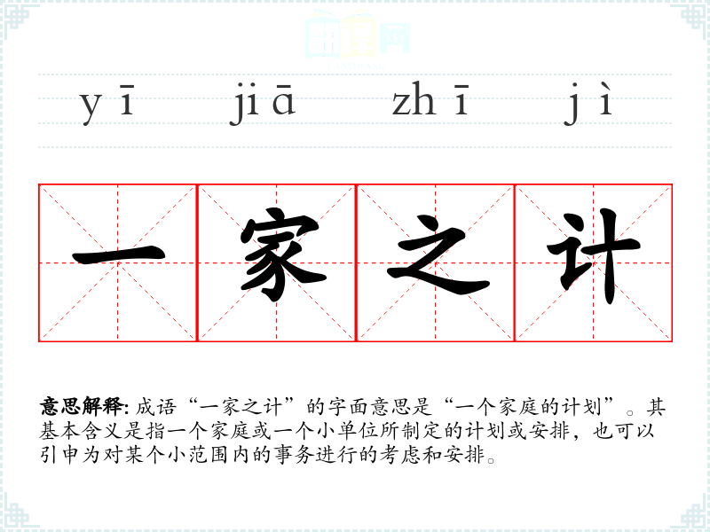 成语“一家之计”的字面意思是“一个家庭的计划”。其基本含义是指一个家庭或一个小单位所制定的计划或安排,也可以引申为对某个小范围内的事务进行的考虑和安排。