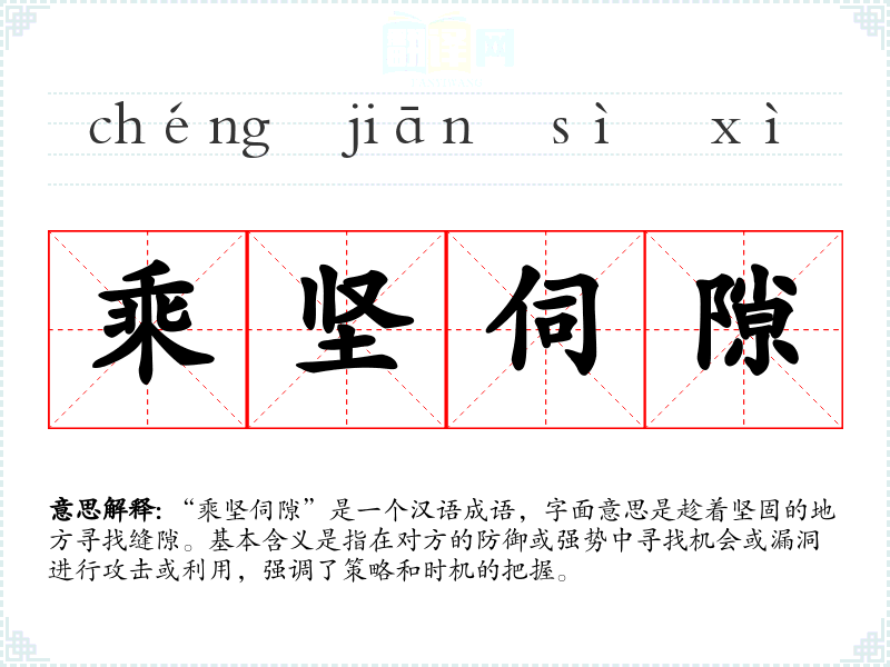 “乘坚伺隙”是一个汉语成语,字面意思是趁着坚固的地方寻找缝隙。基本含义是指在对方的防御或强势中寻找机会或漏洞进行攻击或利用,强调了策略和时机的把握。