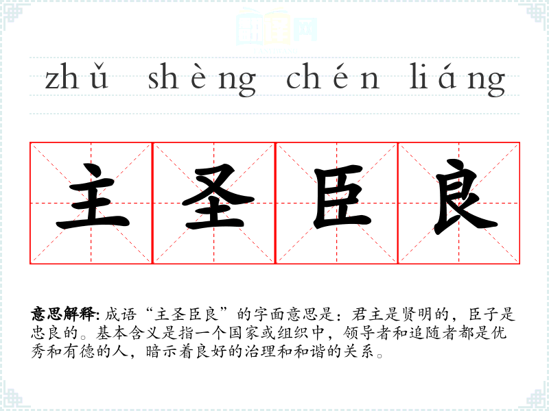 成语“主圣臣良”的字面意思是:君主是贤明的,臣子是忠良的。基本含义是指一个国家或组织中,领导者和追随者都是优秀和有德的人,暗示着良好的治理和和谐的关系。