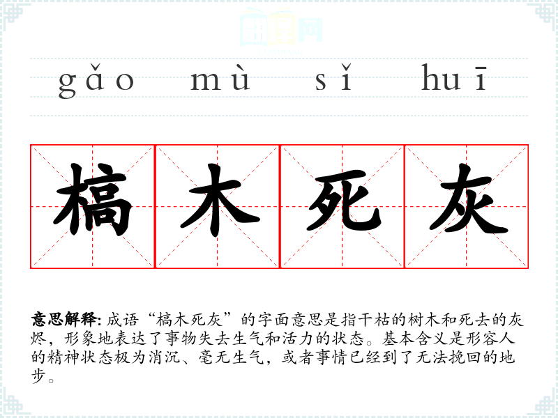 成语“槁木死灰”的字面意思是指干枯的树木和死去的灰烬,形象地表达了事物失去生气和活力的状态。基本含义是形容人的精神状态极为消沉、毫无生气,或者事情已经到了无法挽回的地步。