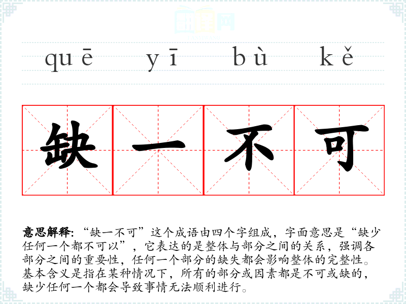 “缺一不可”这个成语由四个字组成,字面意思是“缺少任何一个都不可以”,它表达的是整体与部分之间的关系,强调各部分之间的重要性,任何一个部分的缺失都会影响整体的完整性。基本含义是指在某种情况下,所有的部分或因素都是不可或缺的,缺少任何一个都会导致事情无法顺利进行。