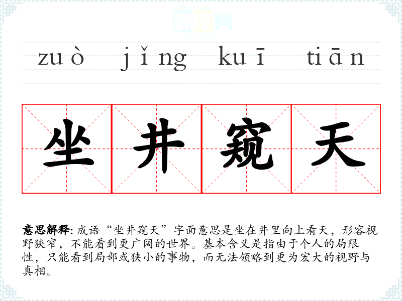成语“坐井窥天”字面意思是坐在井里向上看天,形容视野狭窄,不能看到更广阔的世界。基本含义是指由于个人的局限性,只能看到局部或狭小的事物,而无法领略到更为宏大的视野与真相。