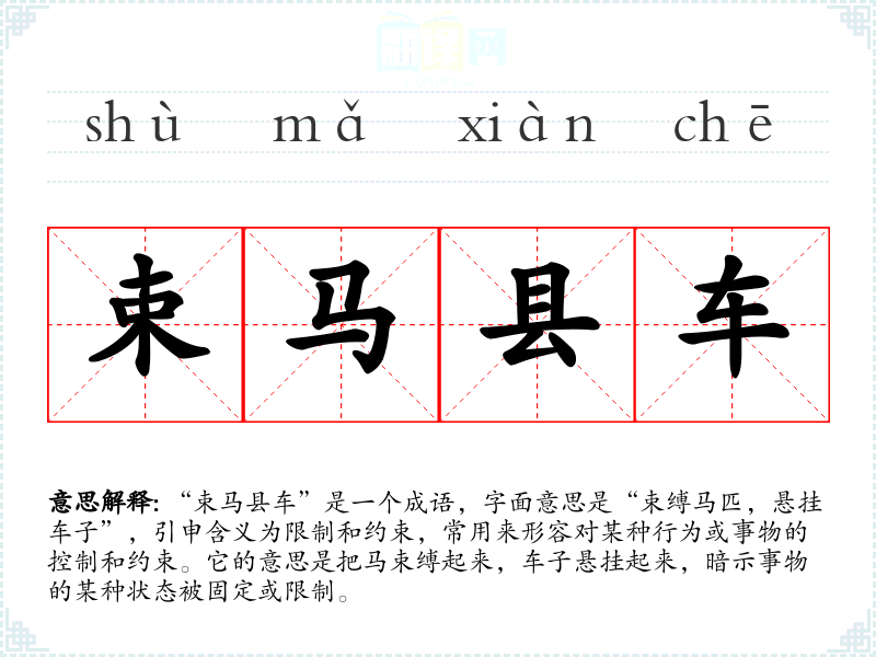 “束马县车”是一个成语,字面意思是“束缚马匹,悬挂车子”,引申含义为限制和约束,常用来形容对某种行为或事物的控制和约束。它的意思是把马束缚起来,车子悬挂起来,暗示事物的某种状态被固定或限制。