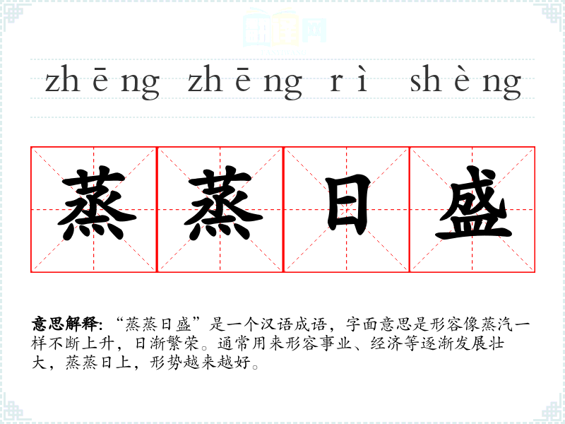 “蒸蒸日盛”是一个汉语成语,字面意思是形容像蒸汽一样不断上升,日渐繁荣。通常用来形容事业、经济等逐渐发展壮大,蒸蒸日上,形势越来越好。