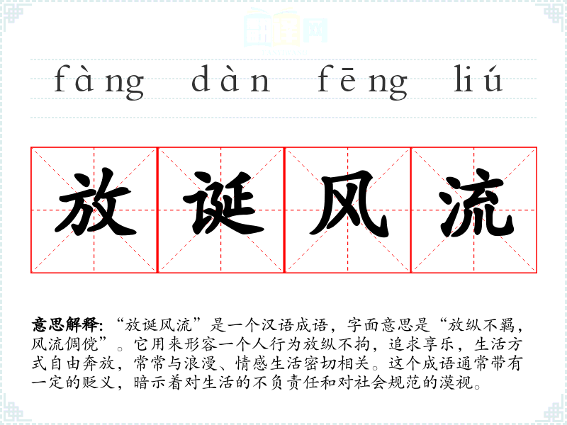 “放诞风流”是一个汉语成语,字面意思是“放纵不羁,风流倜傥”。它用来形容一个人行为放纵不拘,追求享乐,生活方式自由奔放,常常与浪漫、情感生活密切相关。这个成语通常带有一定的贬义,暗示着对生活的不负责任和对社会规范的漠视。