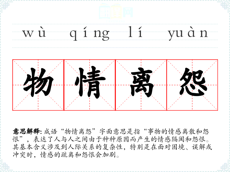 “物情离怨”适用于描述人际关系中的矛盾、分歧、误解等情况。在文学作品中,可以用来描绘角色之间的复杂关系;在日常对话中,可以用于形容朋友之间的争执或家庭中的不和;在演讲中,可以引导听众反思如何化解矛盾、增进理解。