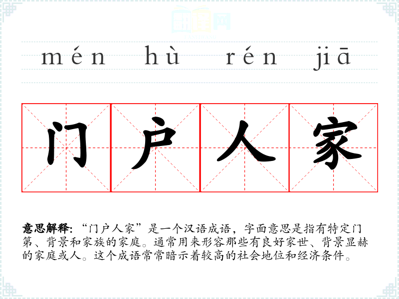 “门户人家”是一个汉语成语,字面意思是指有特定门第、背景和家族的家庭。通常用来形容那些有良好家世、背景显赫的家庭或人。这个成语常常暗示着较高的社会地位和经济条件。