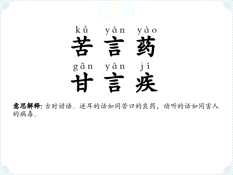 | 苦口之药 | 苦口:口味苦。有疗效的药往往味苦难吃。比喻尖锐的批评,听起来觉得不舒服,但对改正错误很有好处。 |