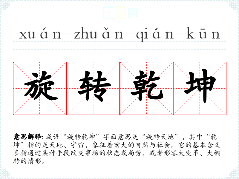 成语“旋转乾坤”字面意思是“旋转天地”,其中“乾坤”指的是天地、宇宙,象征着宏大的自然与社会。它的基本含义多指通过某种手段改变事物的状态或局势,或者形容大变革、大翻转的情形。