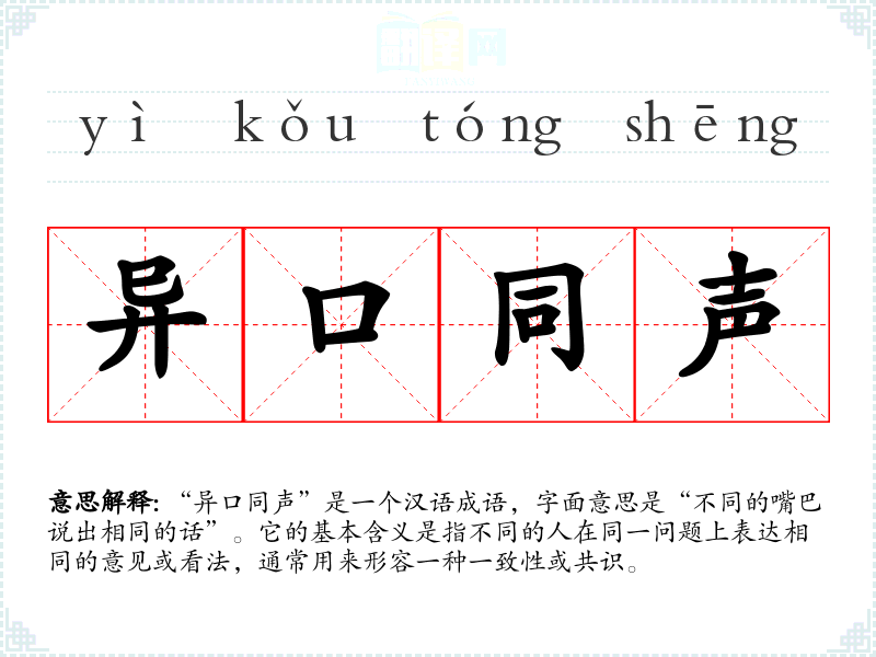 “异口同声”是一个汉语成语,字面意思是“不同的嘴巴说出相同的话”。它的基本含义是指不同的人在同一问题上表达相同的意见或看法,通常用来形容一种一致性或共识。