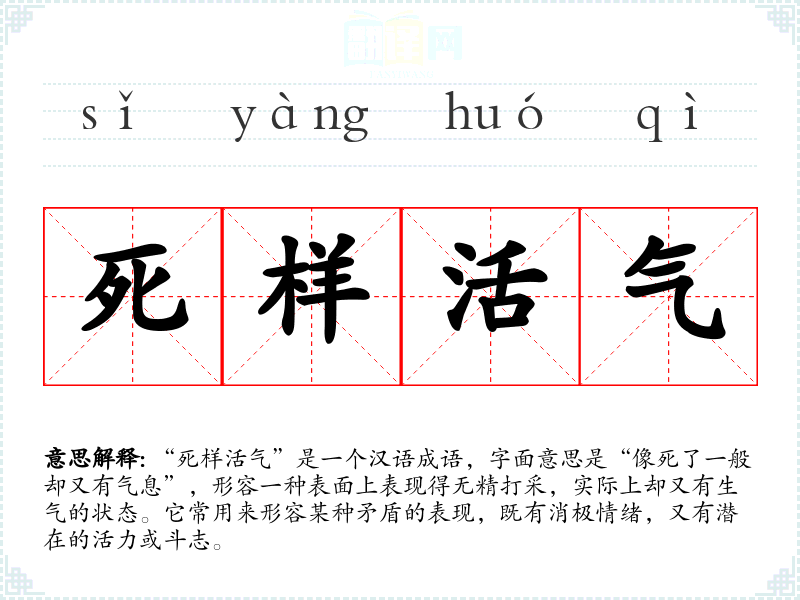 “死样活气”是一个汉语成语,字面意思是“像死了一般却又有气息”,形容一种表面上表现得无精打采,实际上却又有生气的状态。它常用来形容某种矛盾的表现,既有消极情绪,又有潜在的活力或斗志。