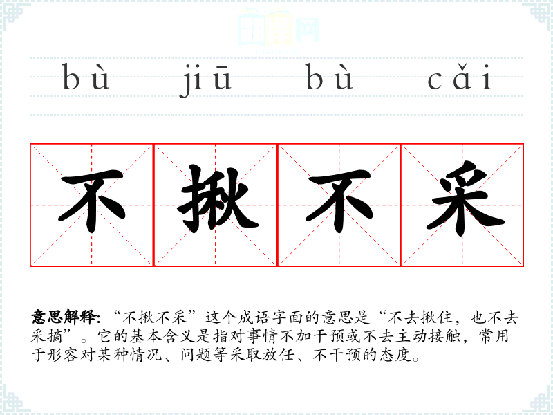 “不揪不采”这个成语字面的意思是“不去揪住,也不去采摘”。它的基本含义是指对事情不加干预或不去主动接触,常用于形容对某种情况、问题等采取放任、不干预的态度。