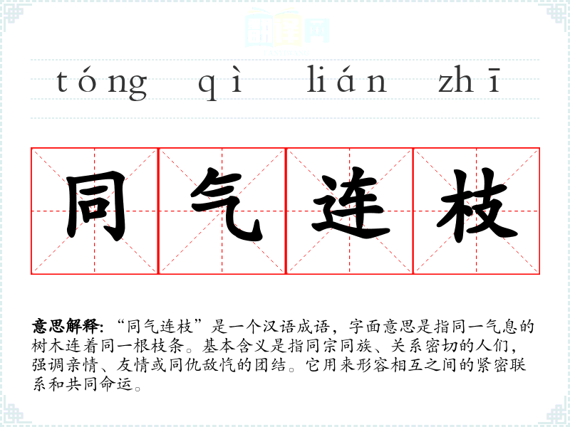 “同气连枝”是一个汉语成语,字面意思是指同一气息的树木连着同一根枝条。基本含义是指同宗同族、关系密切的人们,强调亲情、友情或同仇敌忾的团结。它用来形容相互之间的紧密联系和共同命运。