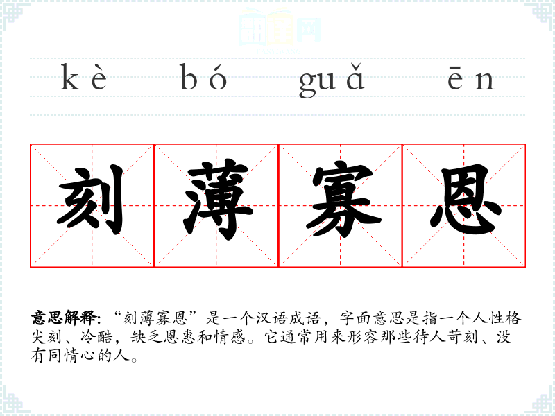 “刻*寡恩”是一个汉语成语,字面意思是指一个人性格尖刻、冷酷,缺乏恩惠和情感。它通常用来形容那些待人苛刻、没有同情心的人。