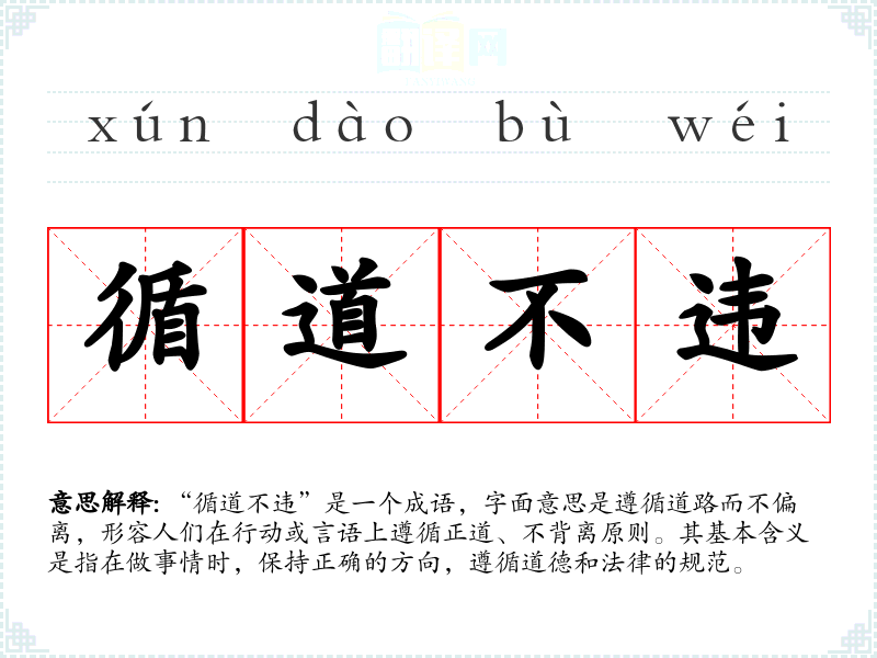 “循道不违”出自《论语·为政》,原文为“子曰:‘君子之道,循之而不违。’”这句话强调君子应当遵循正道,不偏离其原则。这个成语的背景与儒家思想密切相关,强调道德操守和正义感。