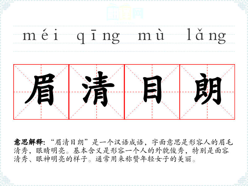 | 眉清目朗 | 眉:眉毛;清:清新;目:眼睛。形容人容貌清秀俊美。 |