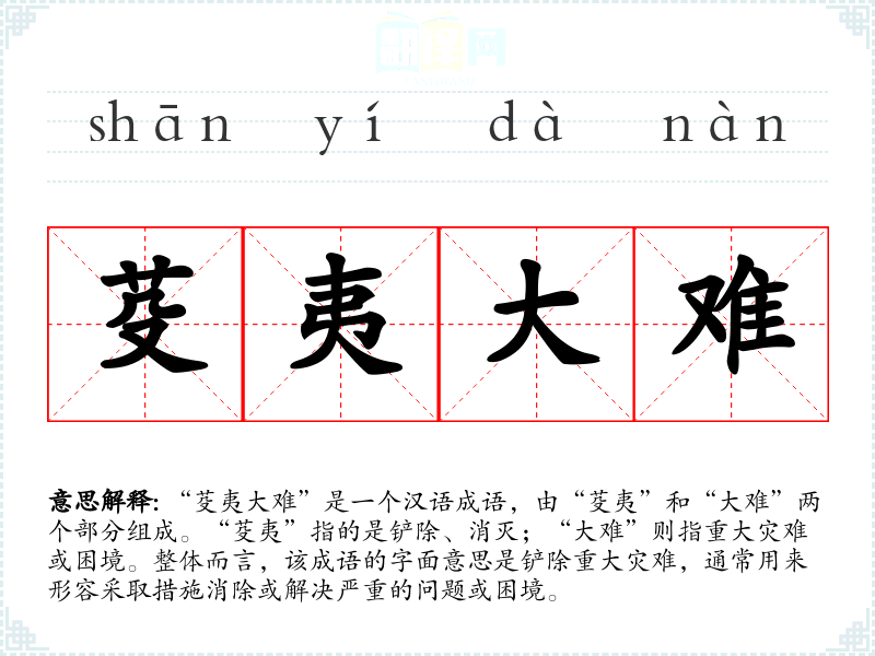 “芟夷大难”是一个汉语成语,由“芟夷”和“大难”两个部分组成。“芟夷”指的是铲除、消灭;“大难”则指重大灾难或困境。整体而言,该成语的字面意思是铲除重大灾难,通常用来形容采取措施消除或解决严重的问题或困境。