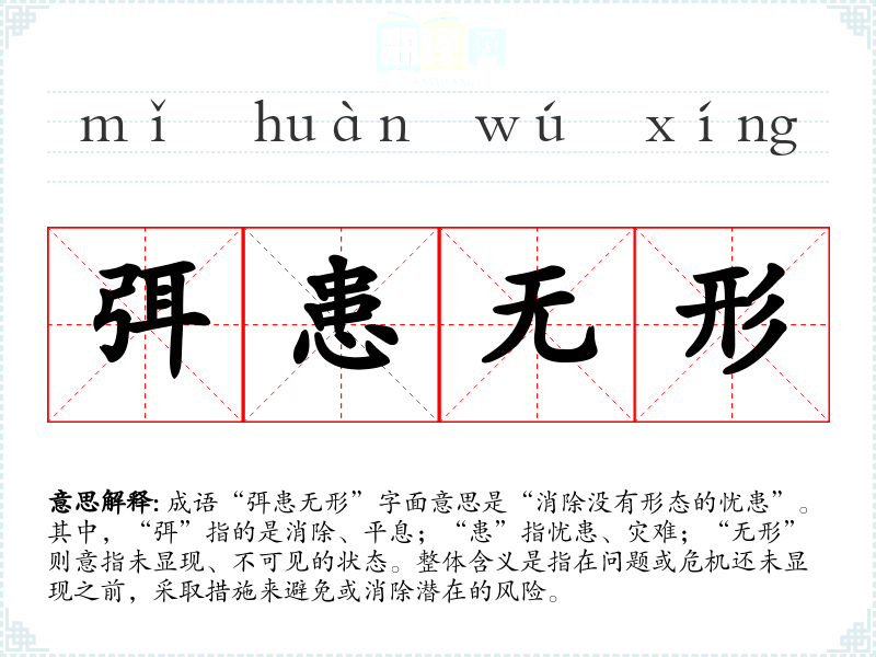 成语“弭患无形”字面意思是“消除没有形态的忧患”。其中,“弭”指的是消除、平息;“患”指忧患、灾难;“无形”则意指未显现、不可见的状态。整体含义是指在问题或危机还未显现之前,采取措施来避免或消除潜在的风险。