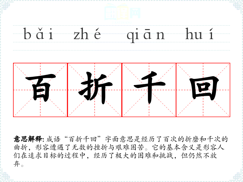 成语“百折千回”字面意思是经历了百次的折磨和千次的曲折,形容遭遇了无数的挫折与艰难困苦。它的基本含义是形容人们在追求目标的过程中,经历了极大的困难和挑战,但仍然不放弃。