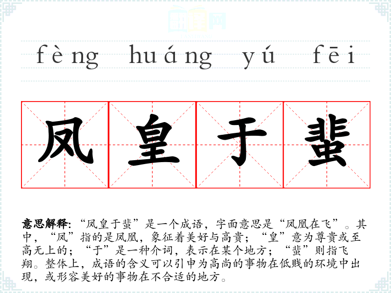 “凤皇于蜚”是一个成语,字面意思是“凤凰在飞”。其中,“凤”指的是凤凰,象征着美好与高贵;“皇”意为尊贵或至高无上的;“于”是一种介词,表示在某个地方;“蜚”则指飞翔。整体上,成语的含义可以引申为高尚的事物在低贱的环境中出现,或形容美好的事物在不合适的地方。