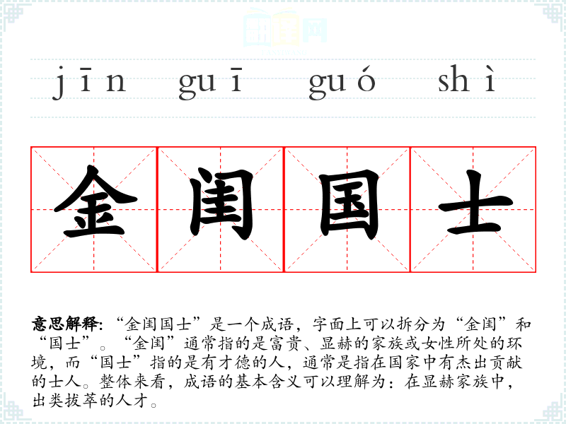 “金闺国士”是一个成语,字面上可以拆分为“金闺”和“国士”。“金闺”通常指的是富贵、显赫的家族或女性所处的环境,而“国士”指的是有才德的人,通常是指在国家中有杰出贡献的士人。整体来看,成语的基本含义可以理解为:在显赫家族中,出类拔萃的人才。