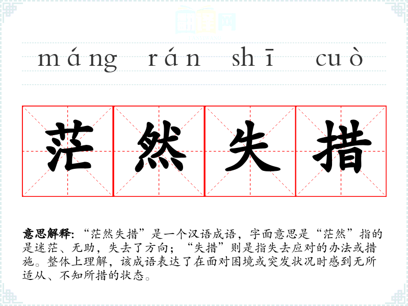 “茫然失措”是一个汉语成语,字面意思是“茫然”指的是迷茫、无助,失去了方向;“失措”则是指失去应对的办法或措施。整体上理解,该成语表达了在面对困境或突发状况时感到无所适从、不知所措的状态。